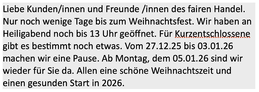Wir freuen uns, dass Sie uns virtuell besuchen und möchten Ihnen auf den nachfolgenden Seiten einige Informationen zum Fairen Handel im Allgemeinen und zu unserem Laden geben.
